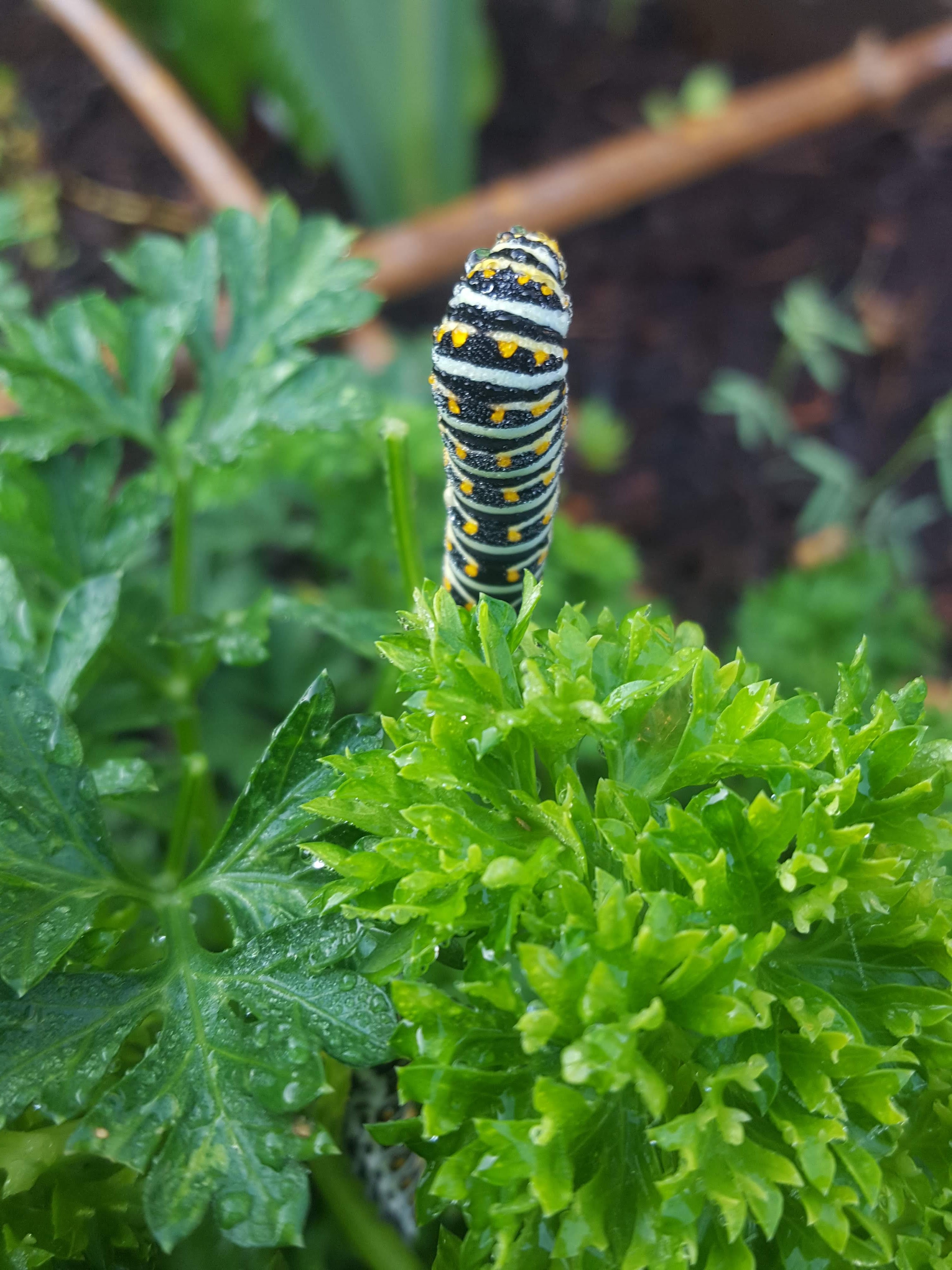 I also encourage some things to come into my garden and enjoy themselves… like the two Black Swallowtail caterpillars resting between feasts on my curly parsley.